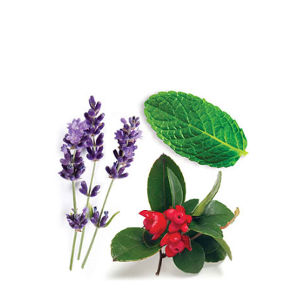 Óleo da folha de Gaultheria procumbens, Óleo de lavanda, Óleo de Mentha piperita, Óleo de Boswellia carterii, Óleo da folha/tronco de coentro, Óleo de flor/folha/tronco de Origanum majorana, Óleo da flor de Anthemis nobilis, Óleo de Ocimum basilicum, Óleo da folha de alecrim.